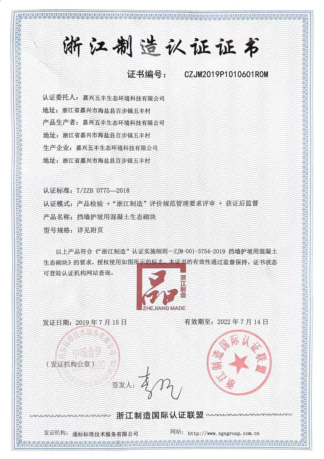 五豐生態(tài)砌塊2011年進(jìn)入浙江省水利先進(jìn)適用技術(shù)(產(chǎn)品) 推廣目錄,2012年通過浙江省科技廳項(xiàng)目驗(yàn)收,獲得科學(xué)技術(shù)成果登記證書。2014年獲得水利部先進(jìn)適用技術(shù)推廣證書。2016年,產(chǎn)品進(jìn)入住建部第一批海綿城市建設(shè)先進(jìn)適用技術(shù)與產(chǎn)品目錄,本公司成為嘉興市海綿城市建設(shè)招標(biāo)采購入圍單位。
